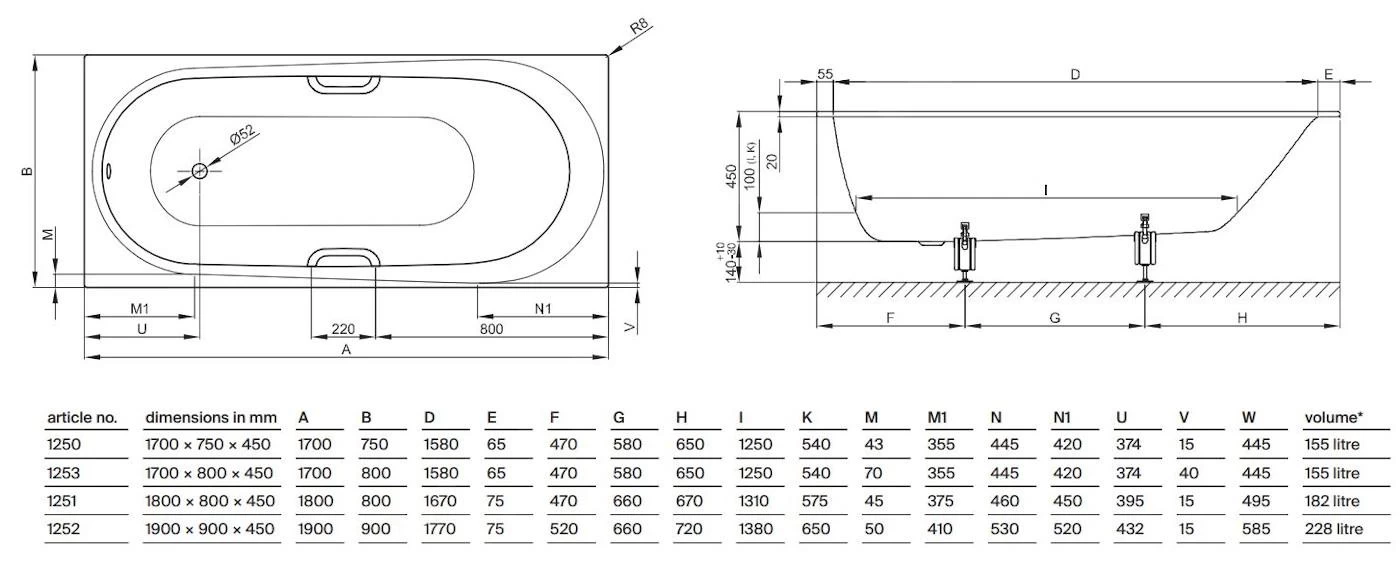 Badpoten en afvoer- en overloopgarnituur met een lengte van 725-1070 mm niet meegeleverd, moeten apart worden besteld.