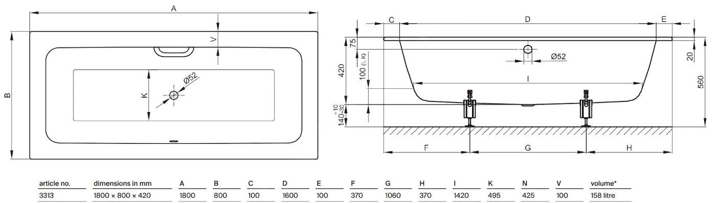 Badpoten en afvoer- en overloopgarnituur met een lengte van 725 mm niet meegeleverd, moeten apart worden besteld.