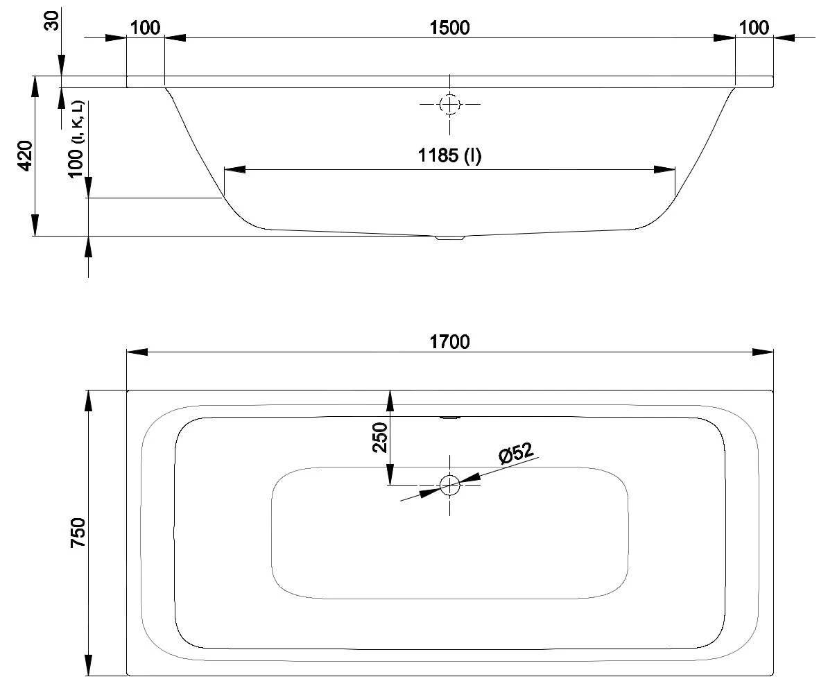 Badpoten en afvoer- en overloopgarnituur met een lengte van 560 mm niet meegeleverd, moeten apart worden besteld.