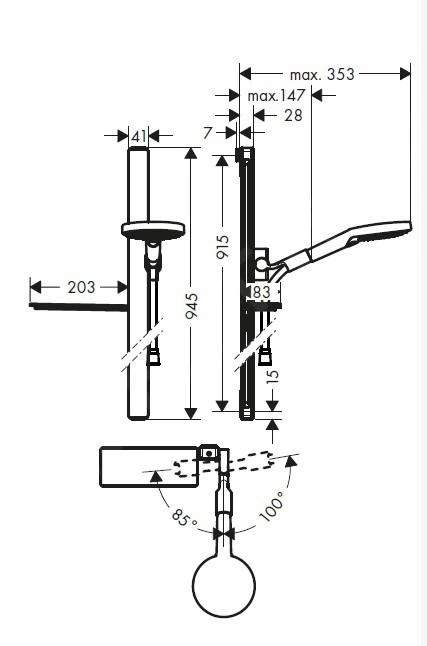 - het glijstuk is binnen een hoek van 90° instelbaar en kan